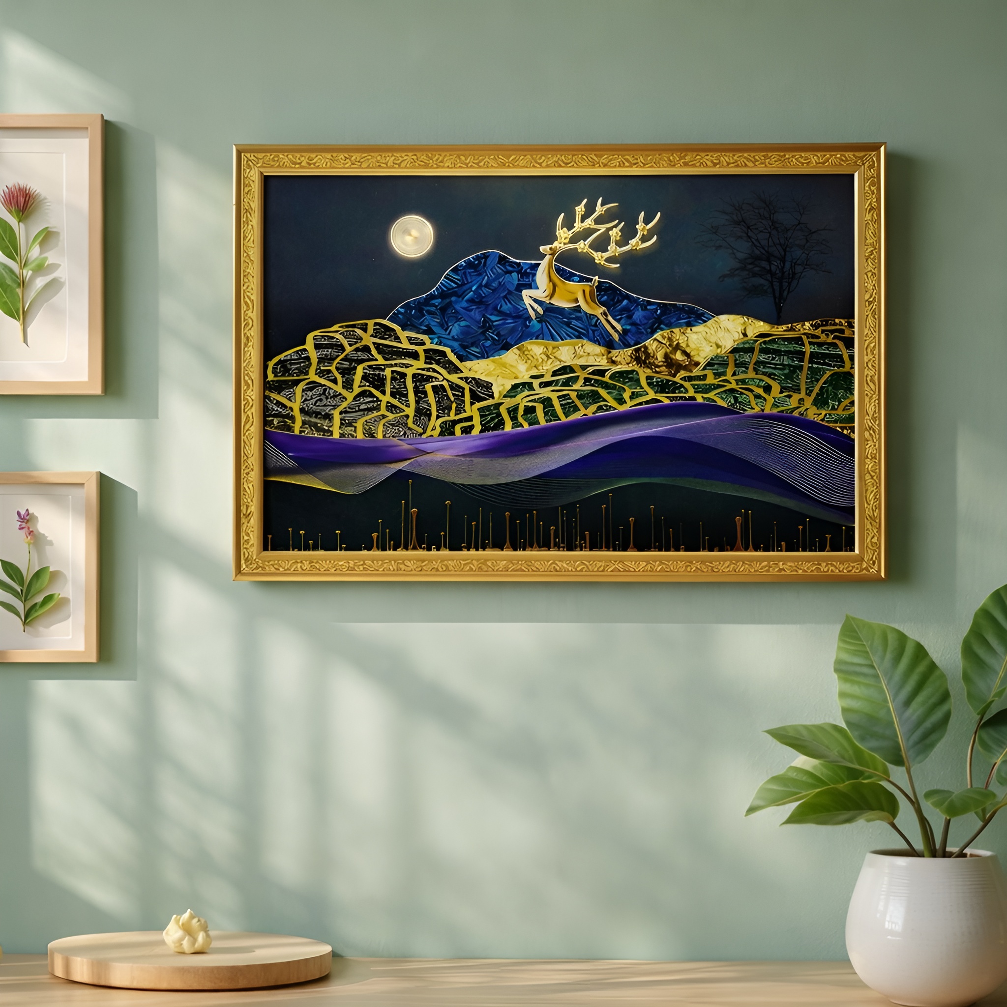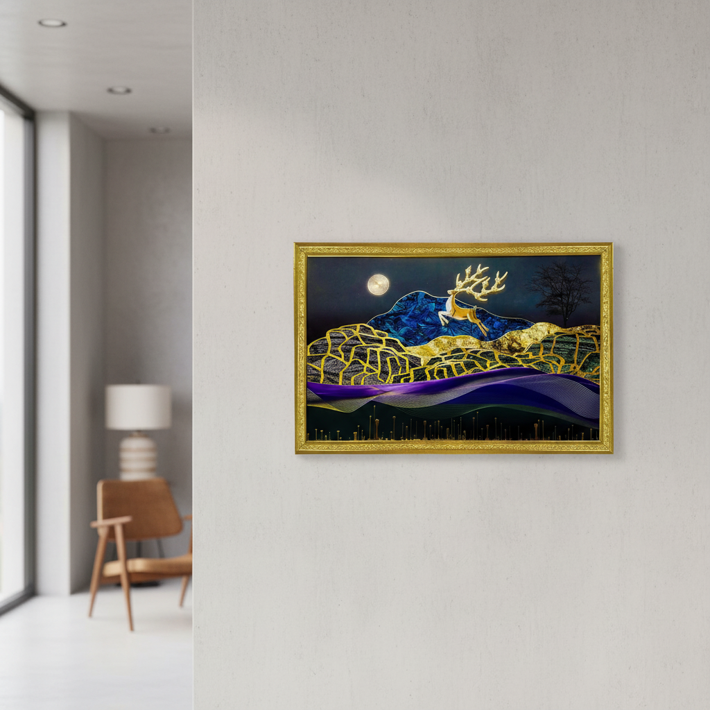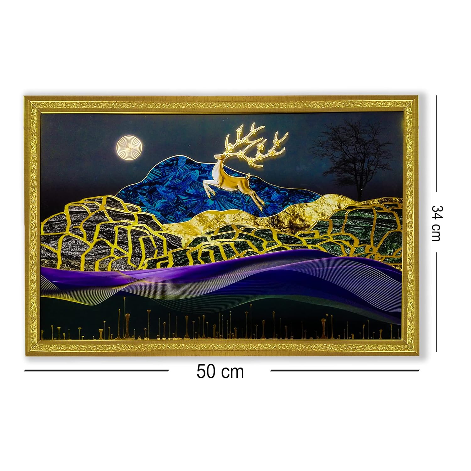 LIFEHAXTORE 3D Golen Foil Modern Art Landscape with Joyful Lucky Reindeer | Framed Painting | Ready to Hang – (Multicolor, 14 Inch x 20 Inch)