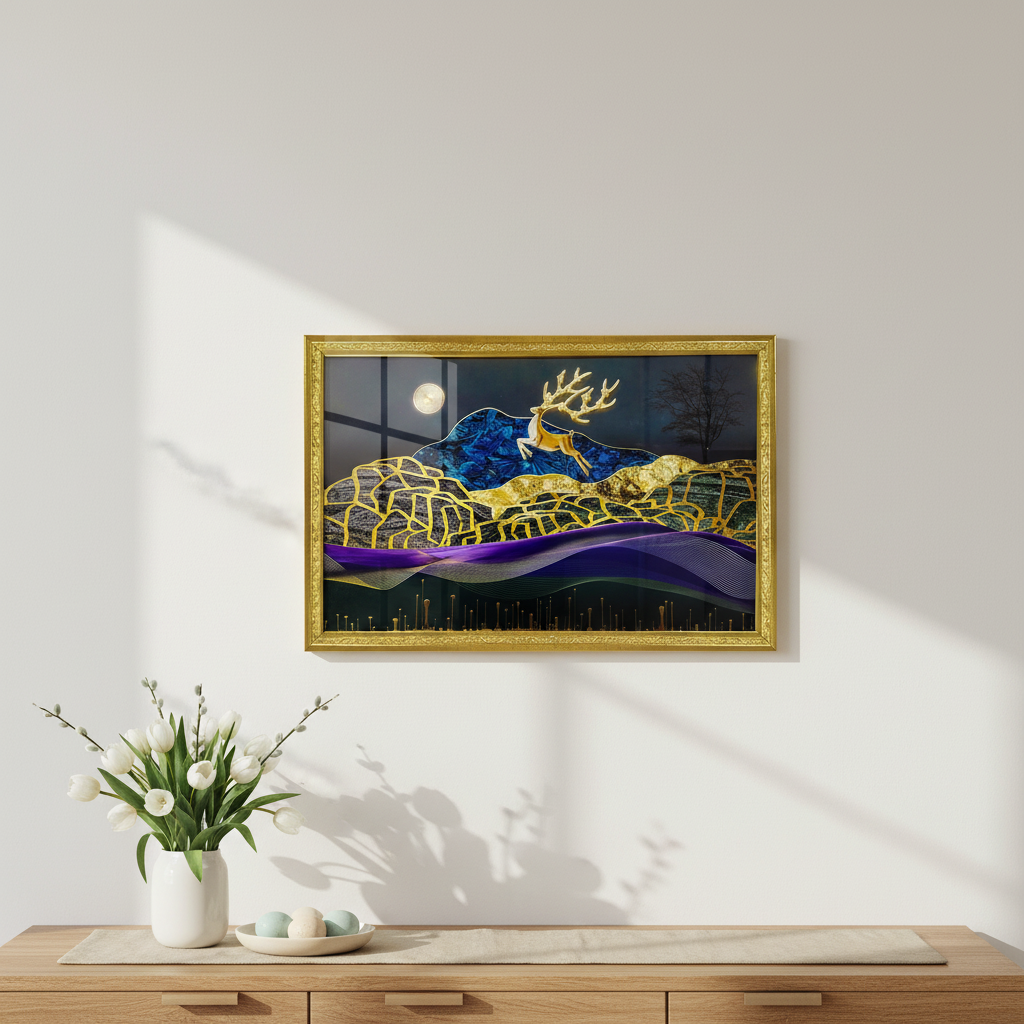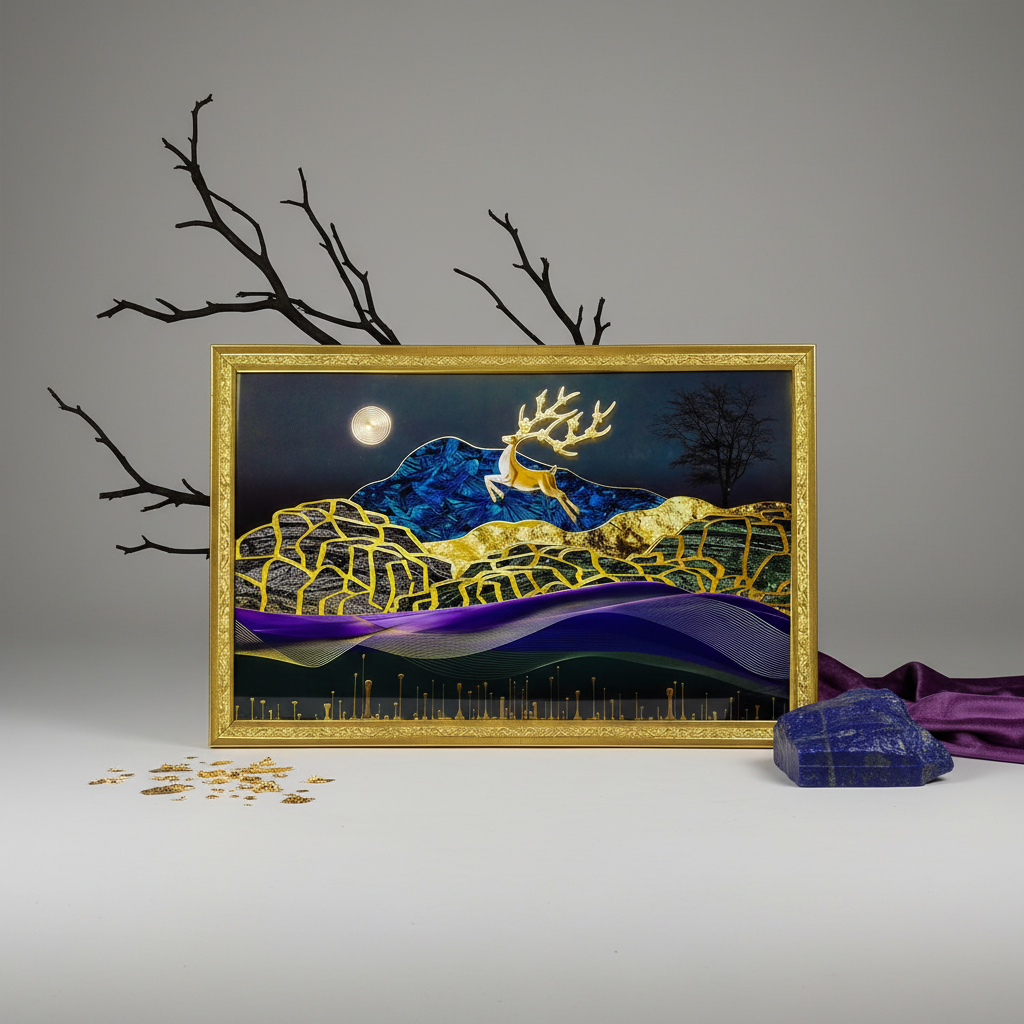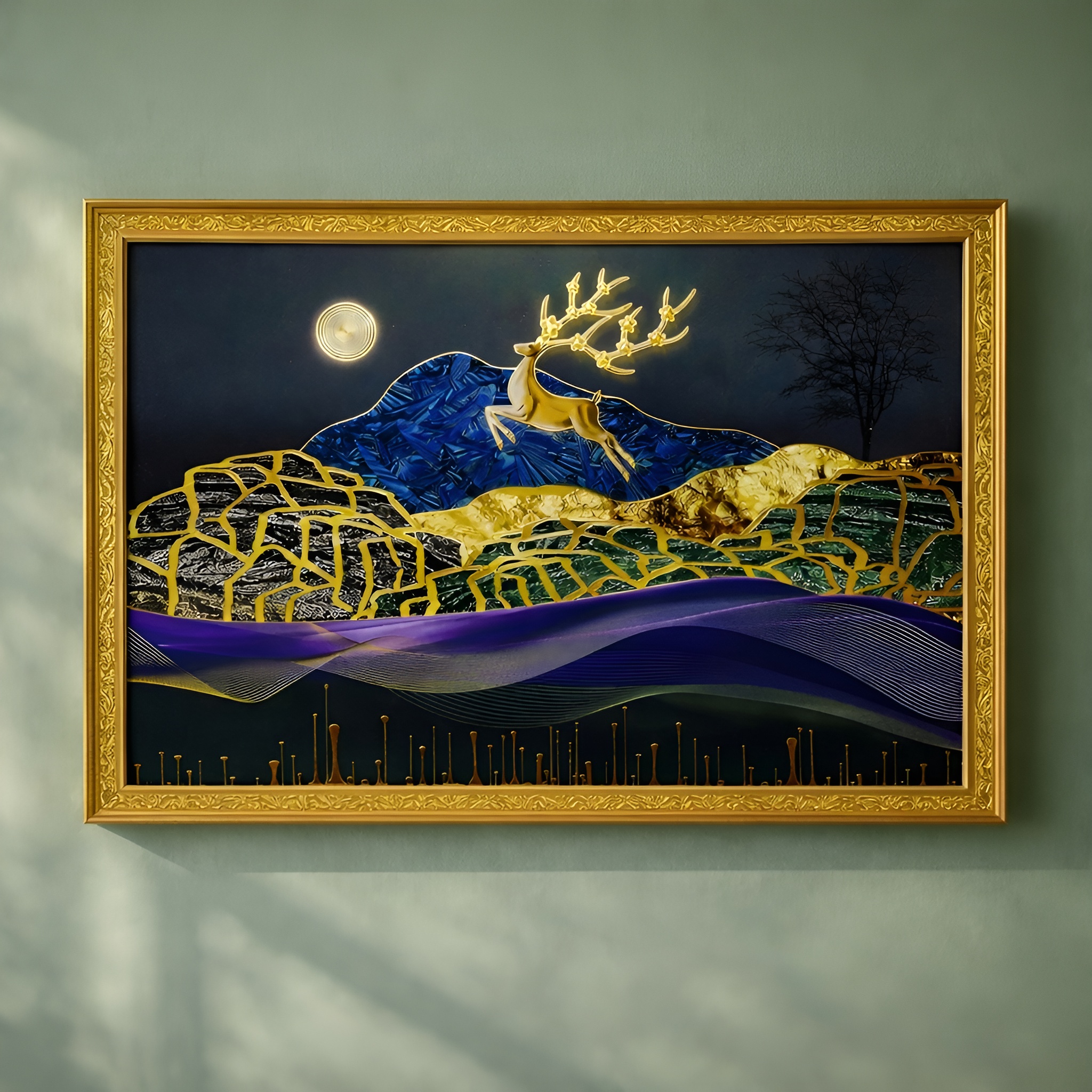 LIFEHAXTORE 3D Golen Foil Modern Art Landscape with Joyful Lucky Reindeer | Framed Painting | Ready to Hang – (Multicolor, 14 Inch x 20 Inch)