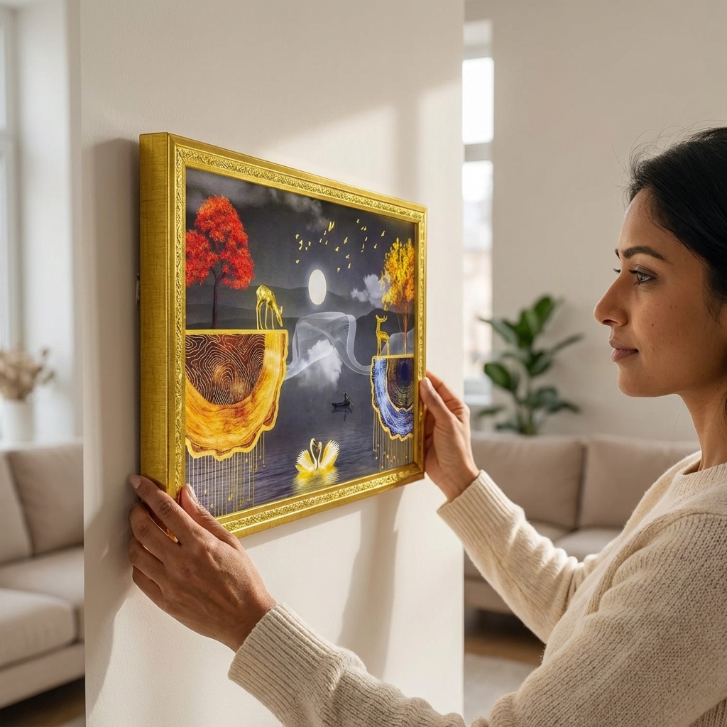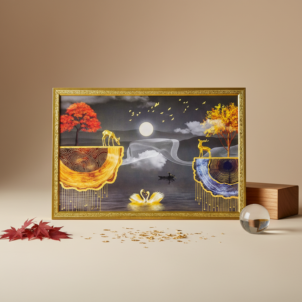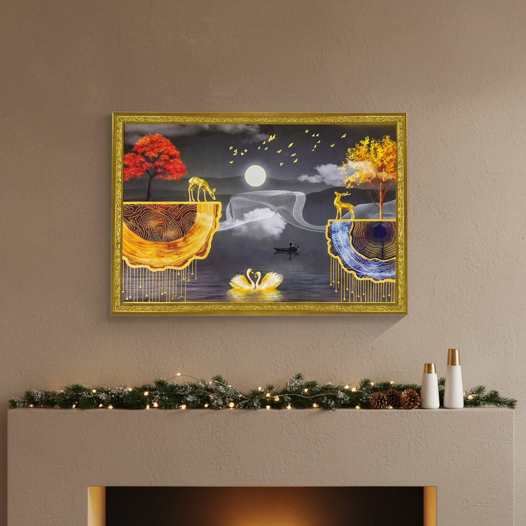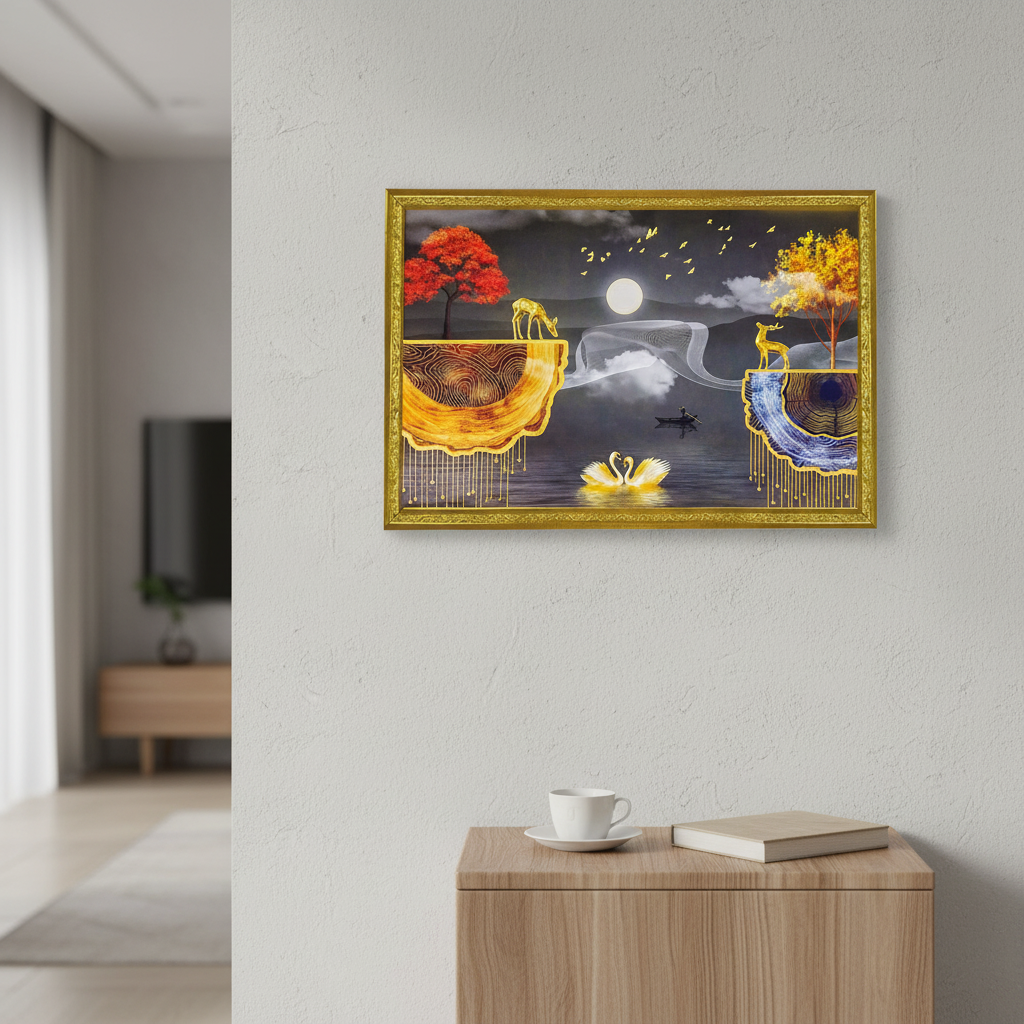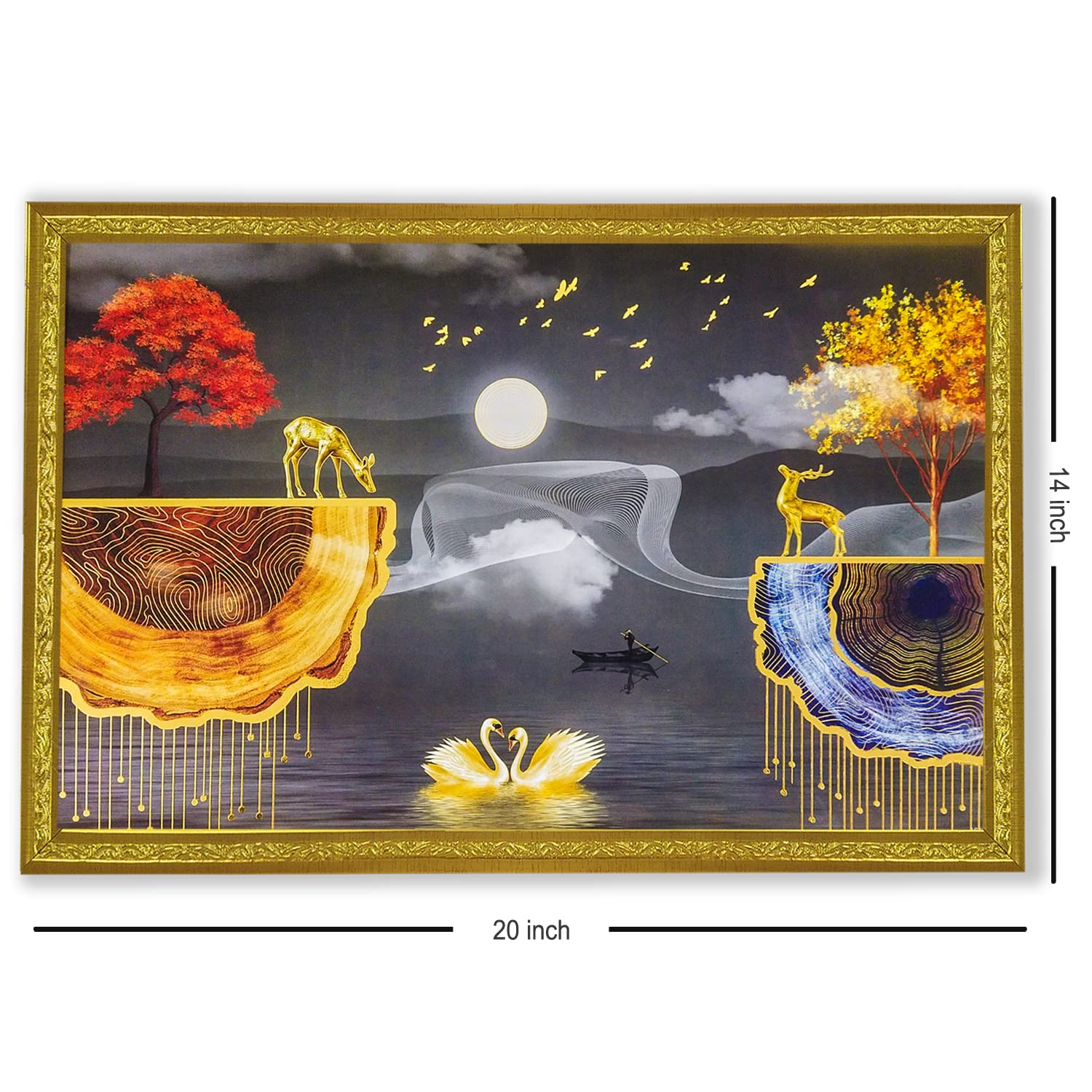 LIFEHAXTORE Abstract art Framed Golden Foil 3D Style Landscape Painting with 2 Deer Standing on Edge | Ready to Hnag – (14 x 20 inch, Multicolor)