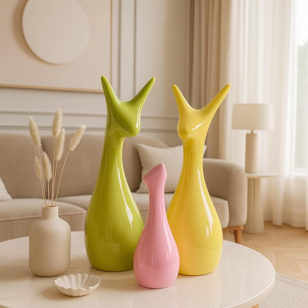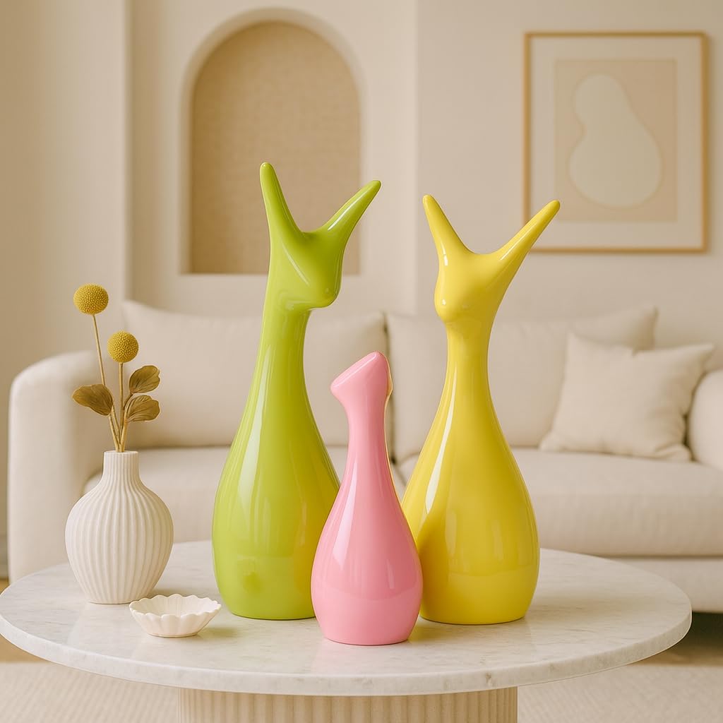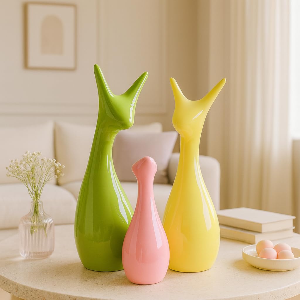 Home Decor Lucky Deer Family Set | Piano Finish Ceramic Figures – (Set of 3 Yellow, Pink, Parrot Color)