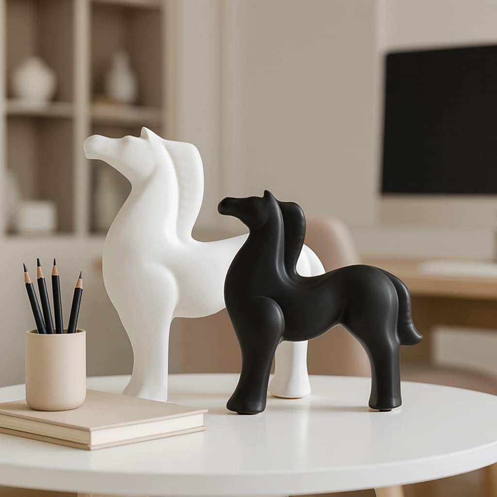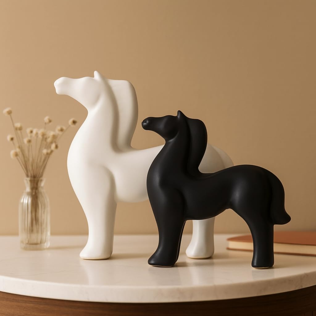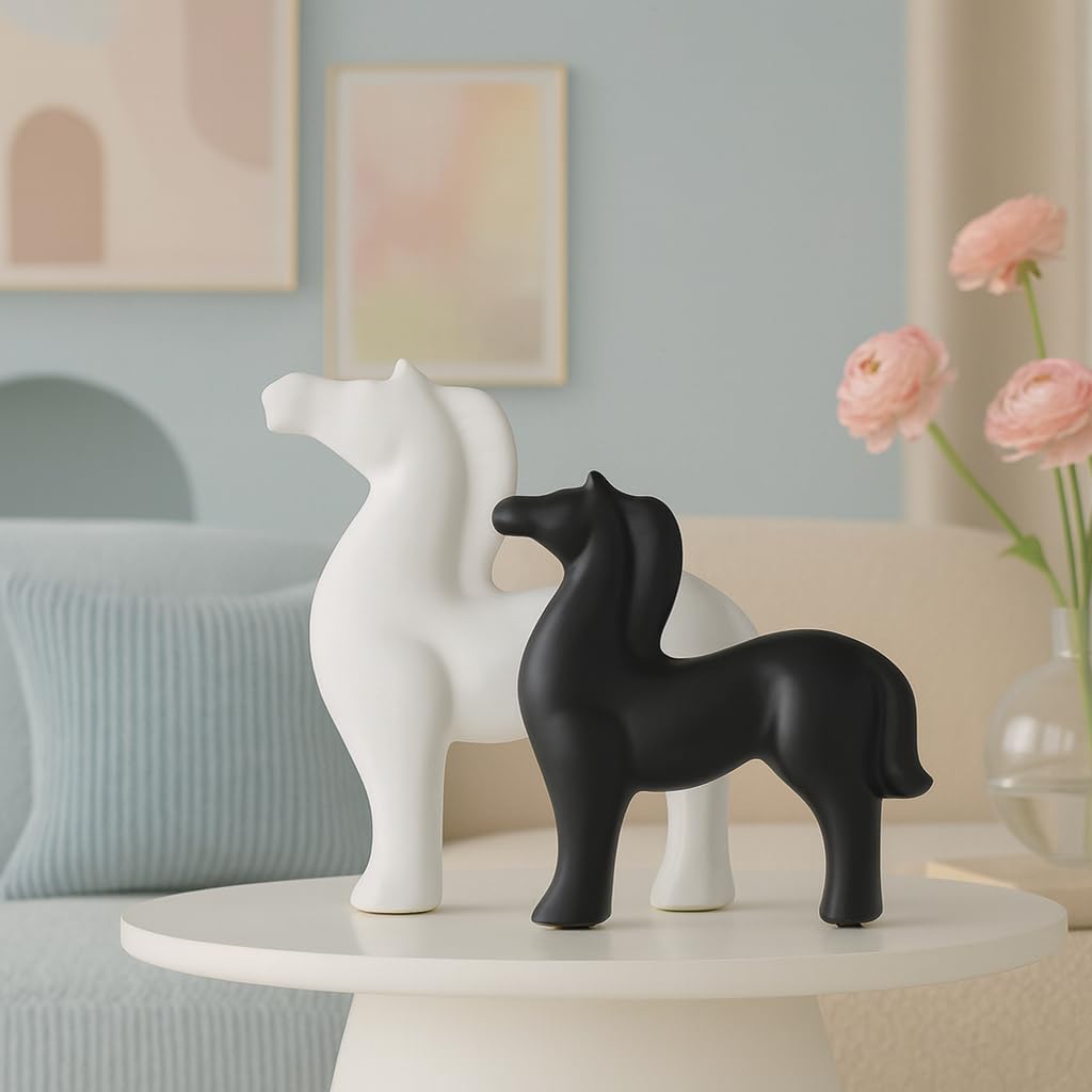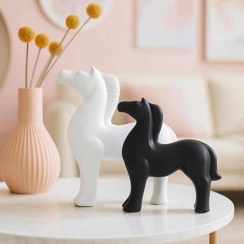Home Decor White and Black Ceramic Horse Figurines – (Pack of 2, Black & White)