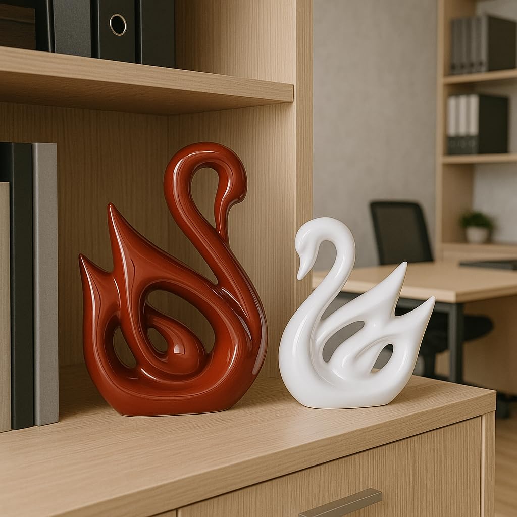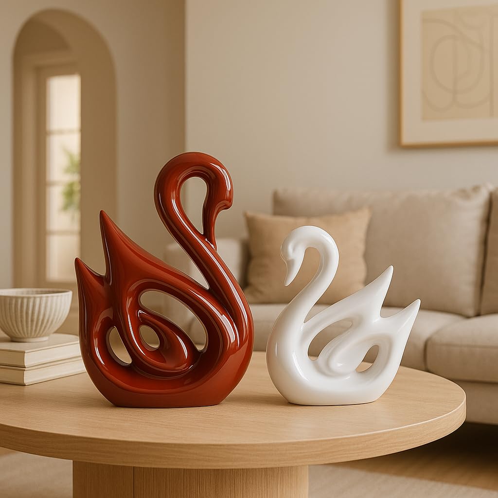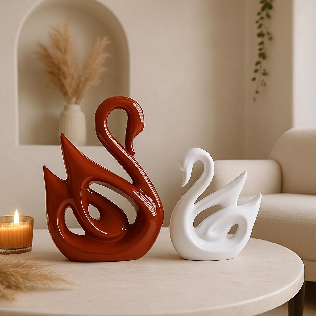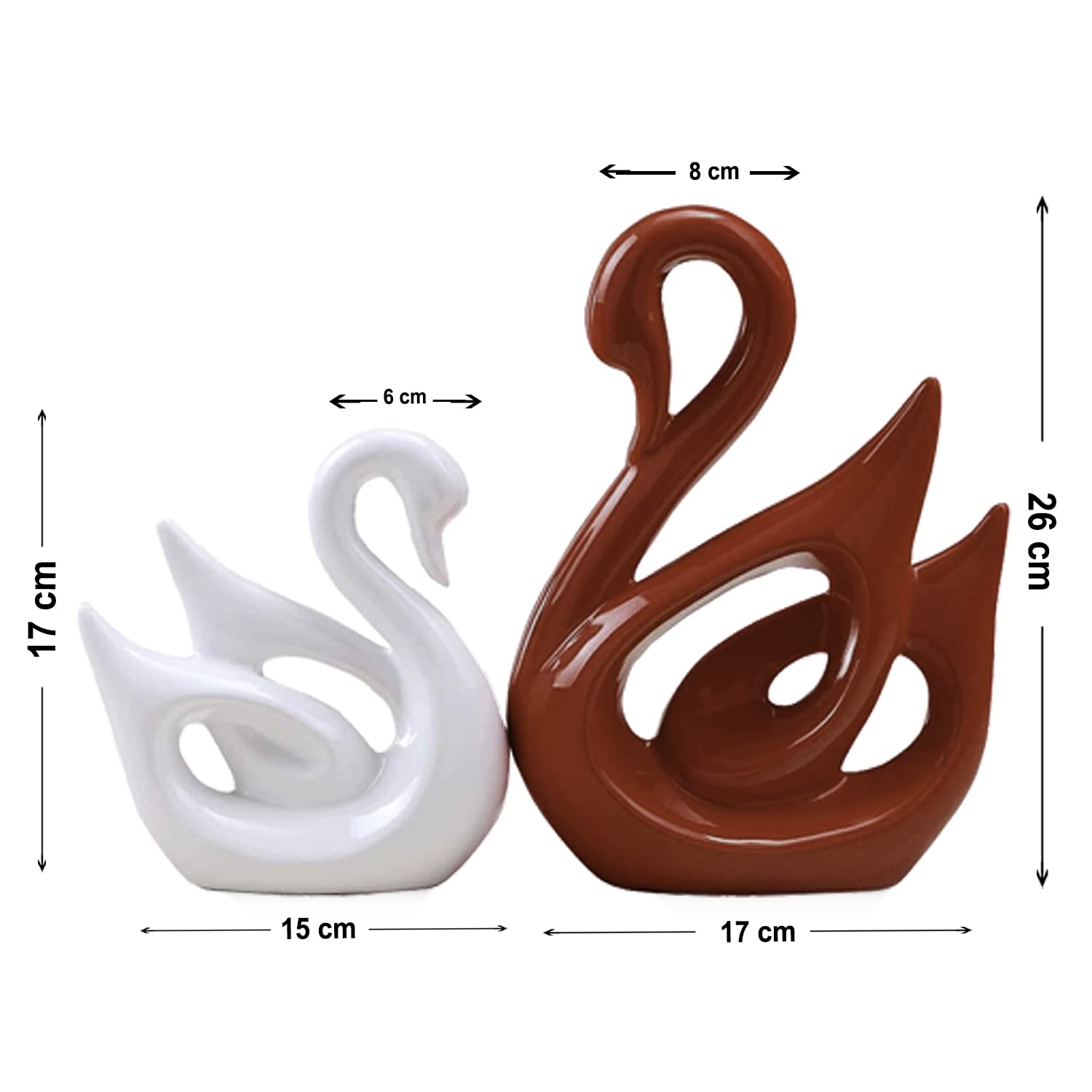 SRJANA Lucky Swan Couple Piano Finish Ceramic Figures for Home Decor (Set of 2 Pc, Large, Brown & White)