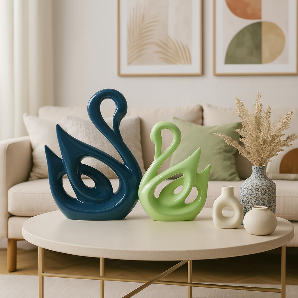 SRJANA Lucky Swan Couple Piano Finish Ceramic Figures for Home Decor (Set of 2 Pc, Large, Navy Blue & Parrot)
