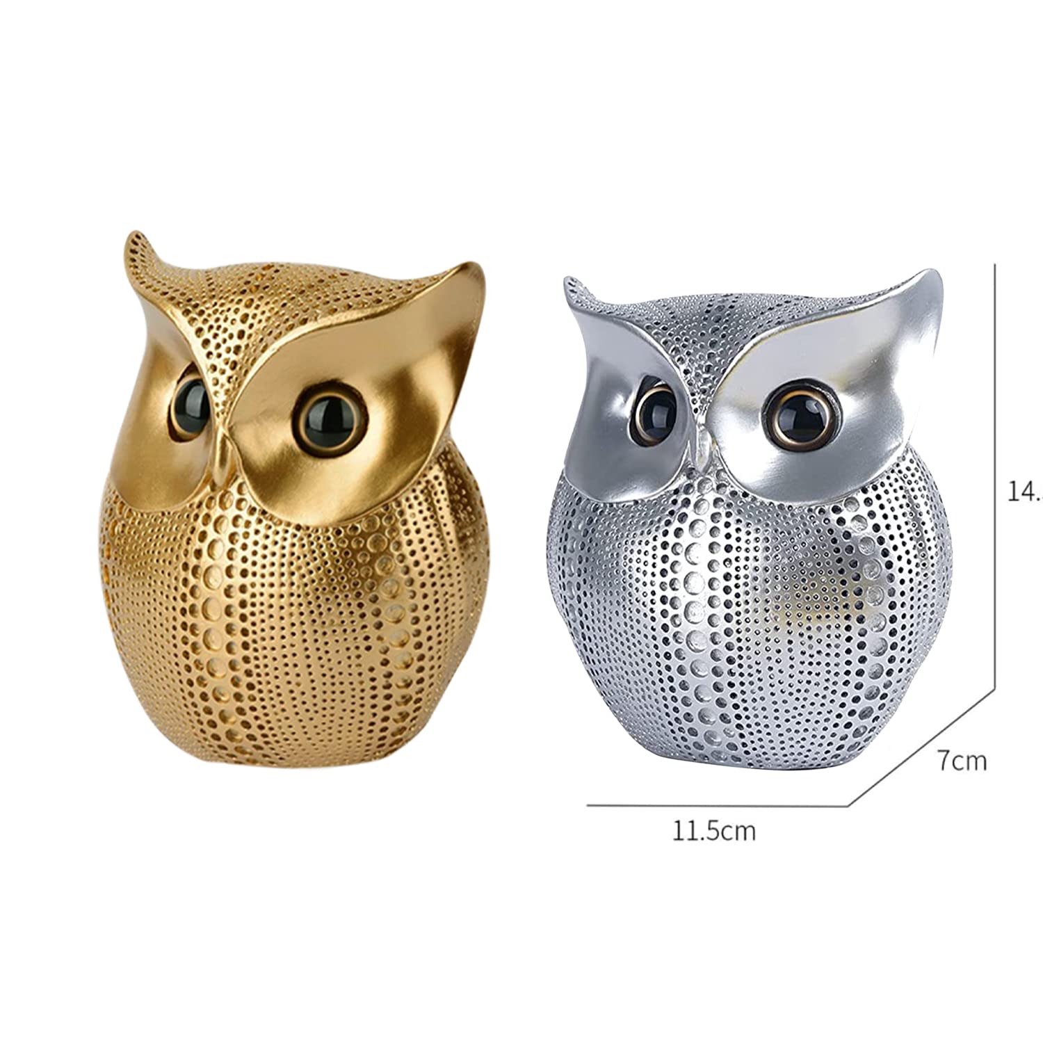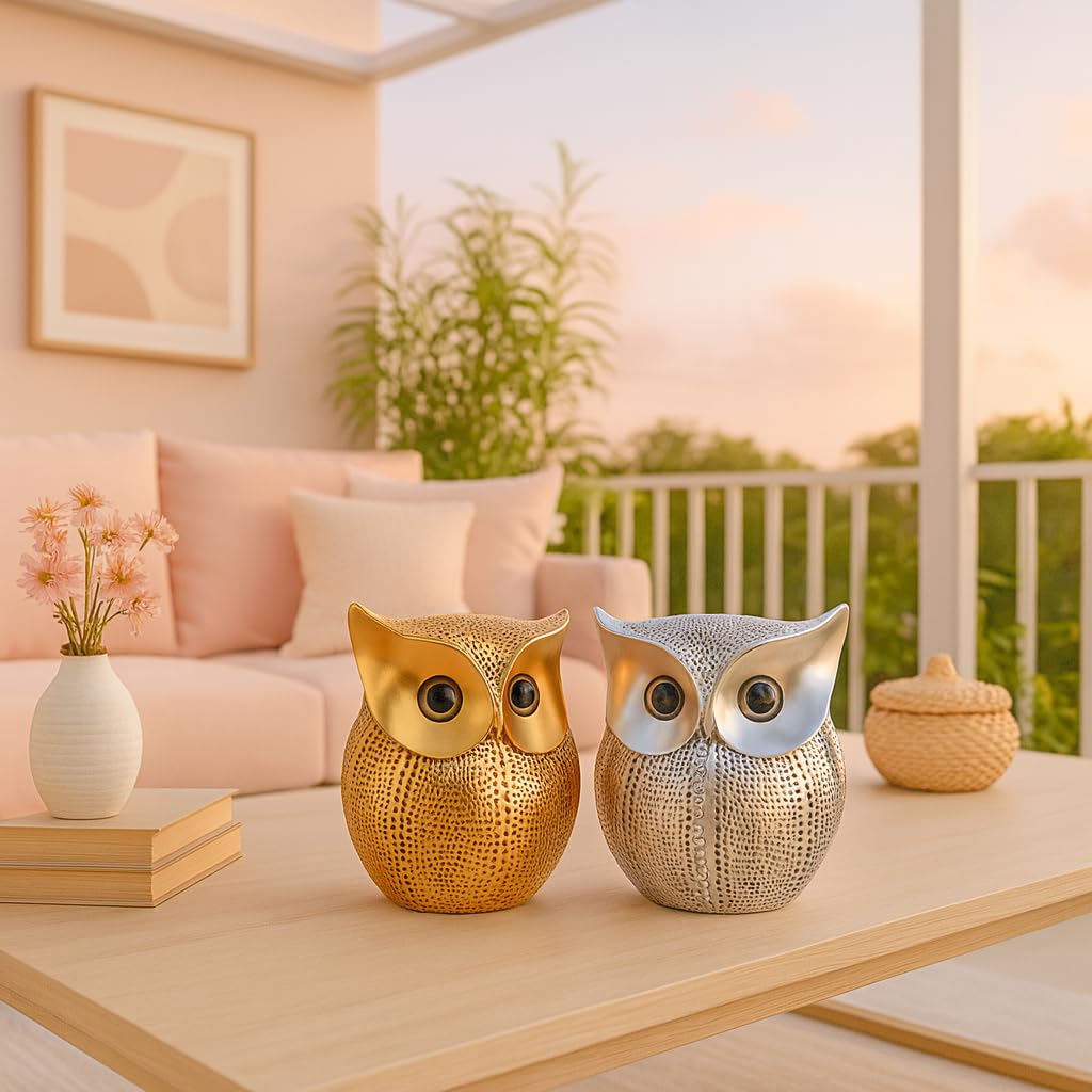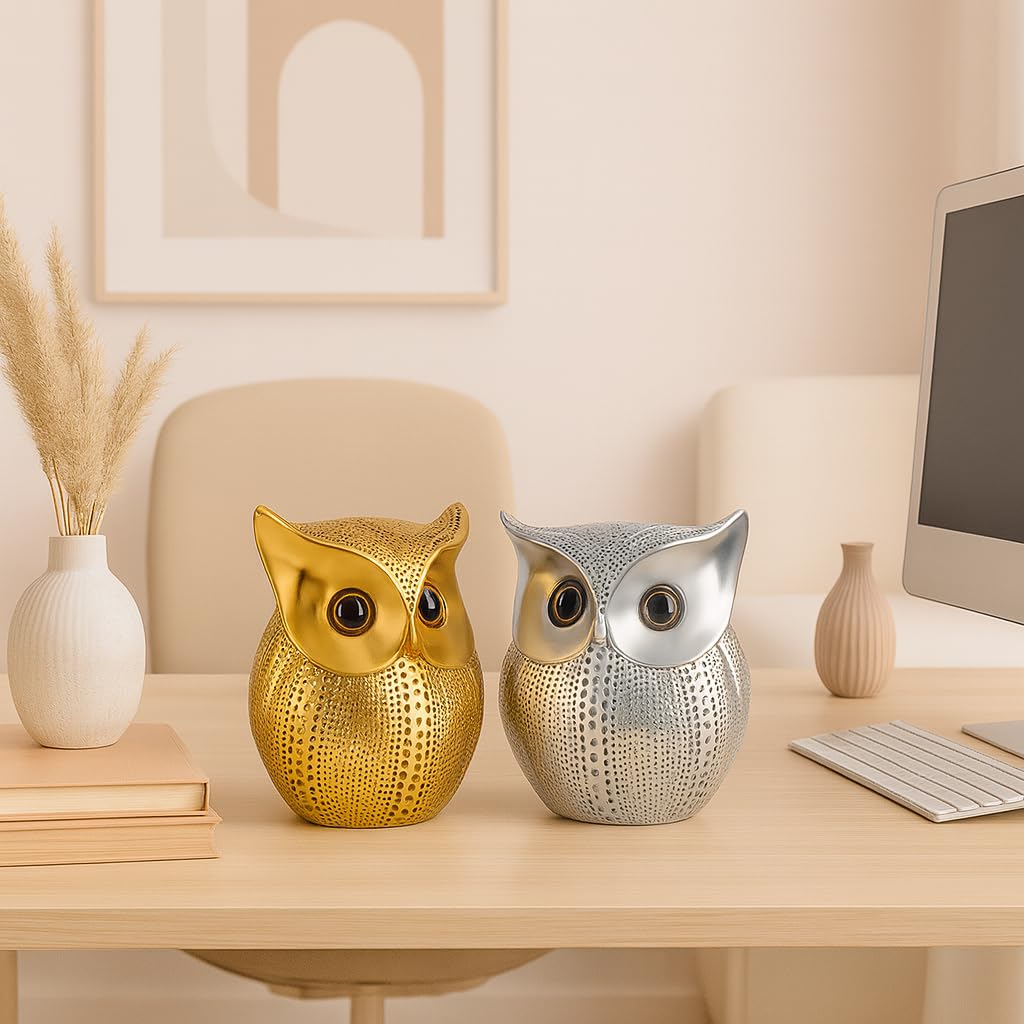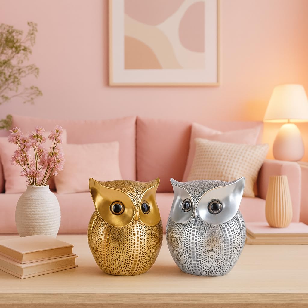 SRJANA Modern Classy Lucky Owl Combo Resin Art Figure Showpiece (Golden and Silver), 2 Piece