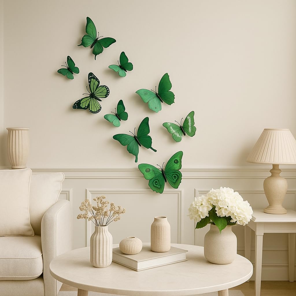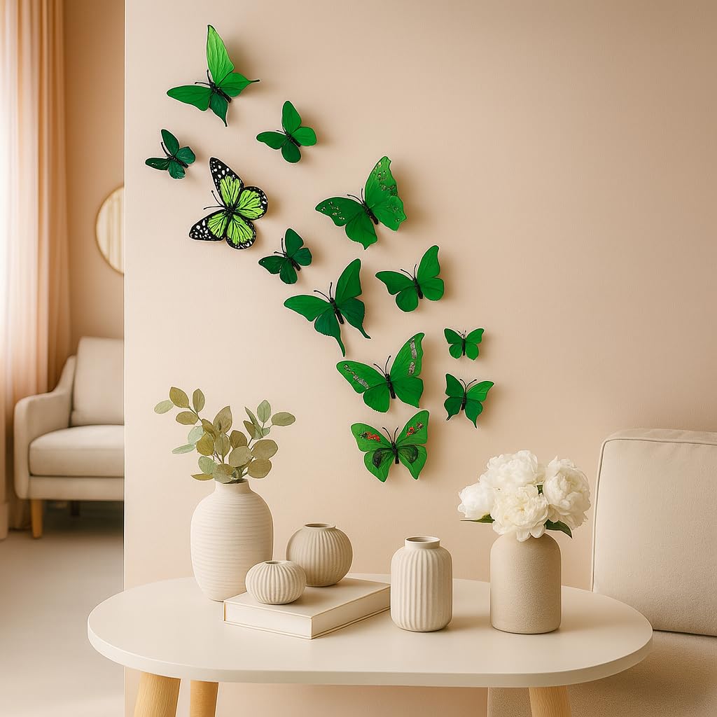 12pcs 3D Home Decor Butterfly | 3D Premium Plastic Build Beautiful Decor Item | Comes with Sticking pad Product (Set of 12) (Flora Green)