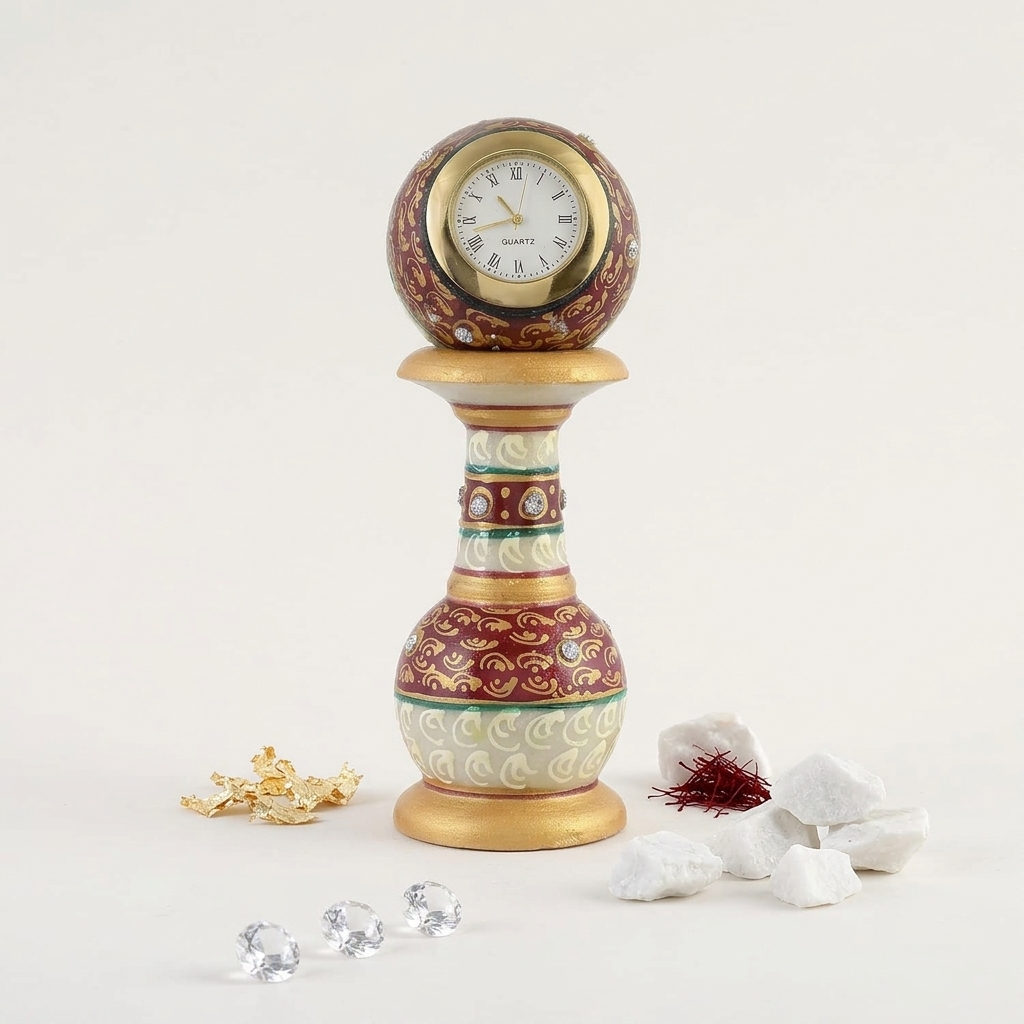Gold Painted Meenakari Work gives antique look to Marble Pillar Watch. A good product for home décor and for gifting.