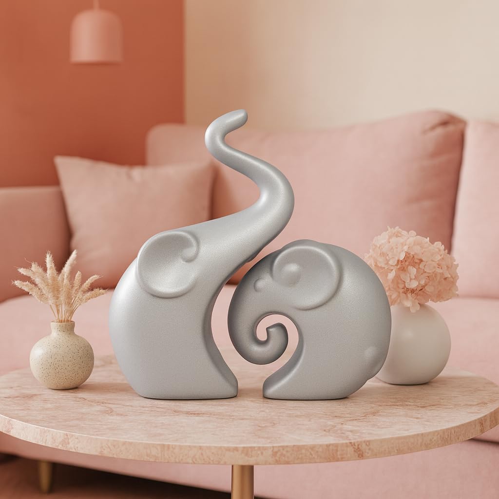 Lavish Silver Home Decor Elephant Couple | Ceramic Figurines (Set of 2, Silver Matte)